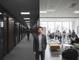Der neue Mitarbeiter betritt zum ersten Mal das Büro. Lange, sterile Flure führen zu identischen…