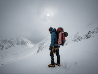 Der Bergsteiger steht 300 Meter unter dem Gipfel. Drei Tage Aufstieg liegen hinter ihm, jeder…