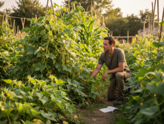 Der Gärtner steht in seinem Permakulturgarten und beobachtet. Wo konventionelle Landwirtschaft in geraden Reihen denkt,…